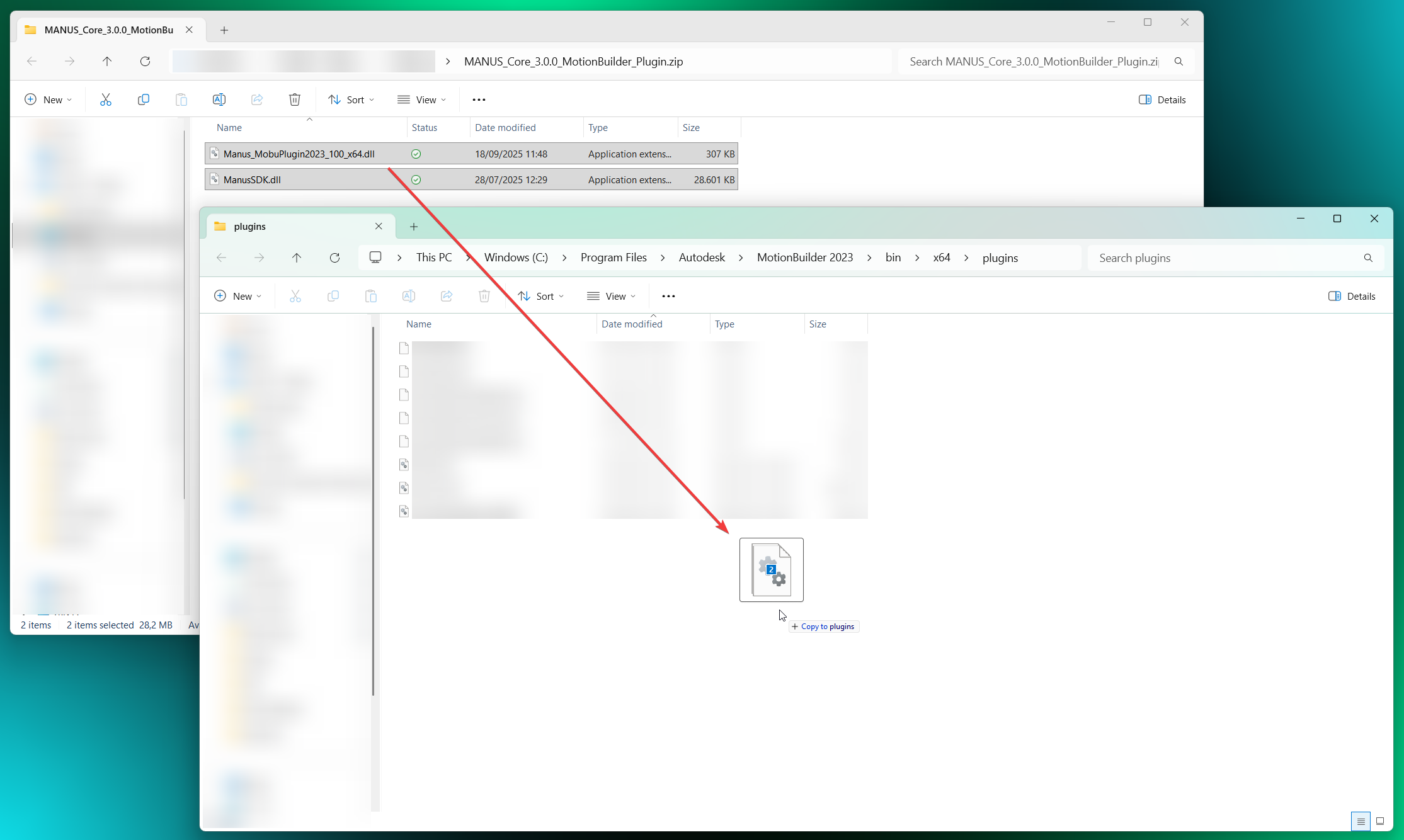 To install the plugin, open the downloaded ZIP file and copy the ManusSDK and Manus_MobuPlugin2023_100_x64 dlls into the plugins directory found in the bin/x64 directory within your MotionBuilder's installation directory: