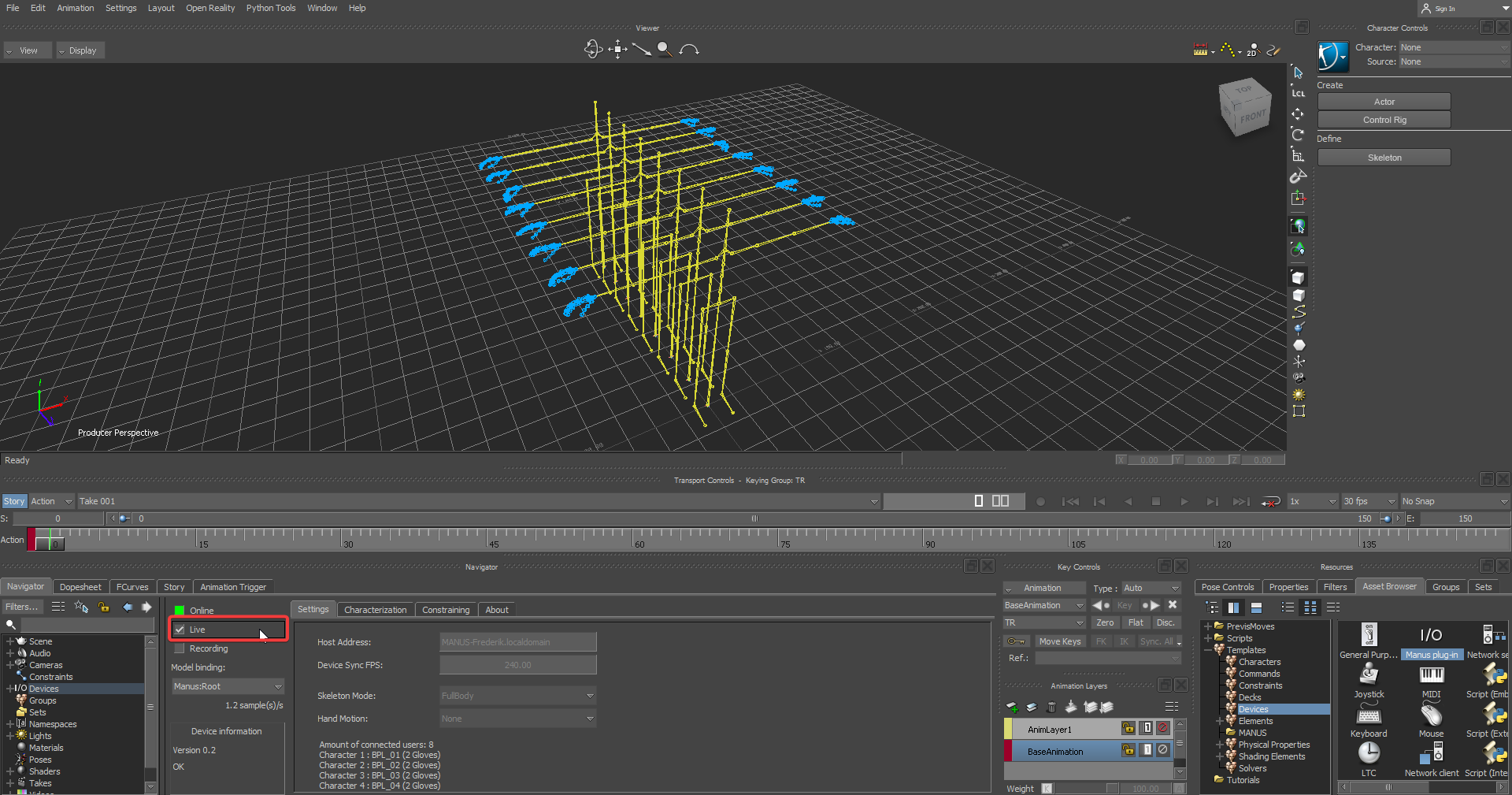 To start the data stream from MANUS Core to the MotionBuilder plugin, toggle on the Live toggle in the MANUS plug-in device.