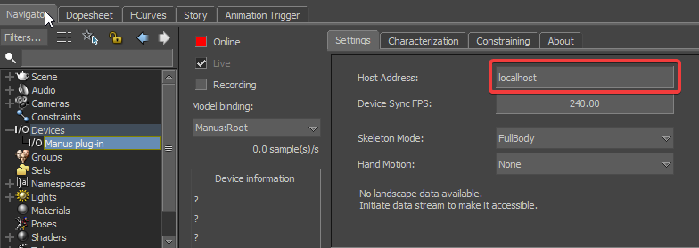 The plugin can be set up to receive MANUS Core data locally, using the localhost hostname: