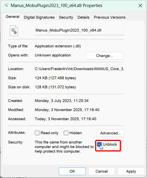 Windows will sometimes treat downloaded files as suspicious and block them from running. As a result, MotionBuilder might not be able to load the plugin. Check the Unbock toggle of both ManusSDK and Manus_MobuPlugin dll's, if you run into any problems. Right-click on the dll file, select Properties, got to the General tab, at the bottom after Security:.