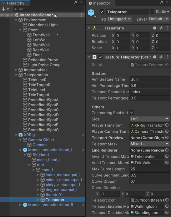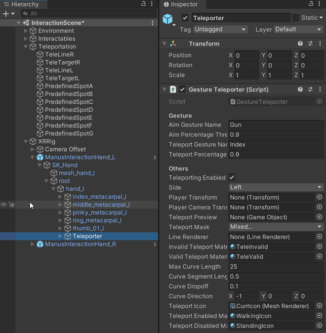 On ManusInteractionHand(L/R) open the hierarchy until we find a node called Teleporter, select it, and on the inspector we can see two fields that need to be filled in: