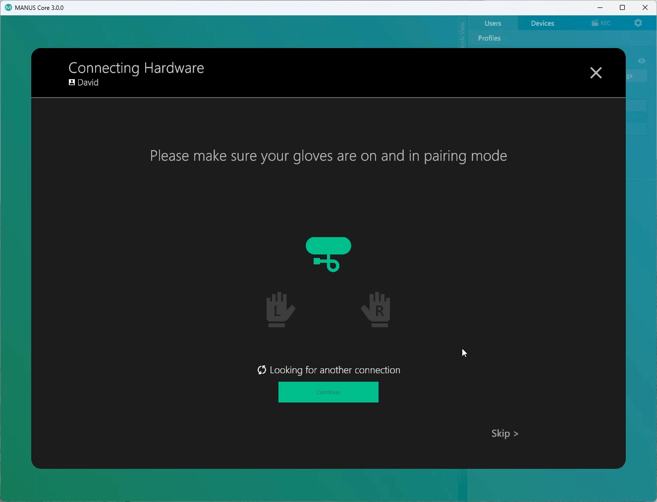 Turn on your gloves, and hold the switch to the right to put them into pairing mode.